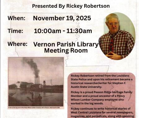 Join the Vernon Parish Library for Sawmill Town of Peason with speaker Rickey Robertson on Wednesday, November 19th from 10-11:30am. this event is free. For more information, see the flyer here.