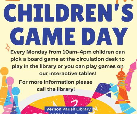 Join the Vernon Parish Library for Children’s Game Day in the Children’s Wing on Monday, November 17th from 10am to 4pm. For more information, see the flyer here.