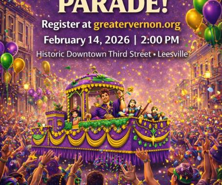 Join the Celebration at the 2026 Greater Vernon Chamber of Commerce Mardi Gras Parade rolling down beautiful historic Third Street in Downtown Leesville on February 14th at 2pm!