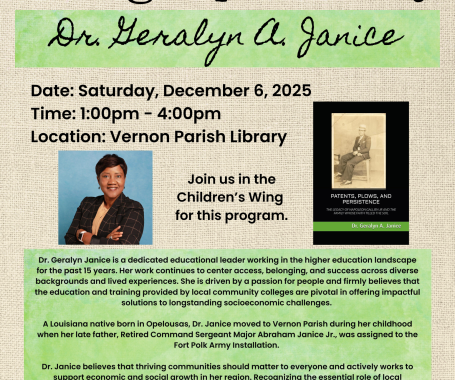 Janice, an accomplished educational leader and Louisiana native, will be signing copies of her inspiring debut book, Patents, Plows, and Persistence, which explores stories of resilience deeply rooted in Louisiana soil. Stop by the Children’s Wing at the Vernon Parish Library on December 6th from 1-5pm to meet Dr. Janice, learn about her work, and celebrate local storytelling and community pride. See the flyer here.
