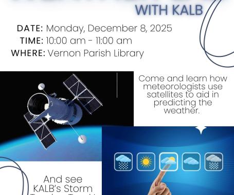 Join the Vernon Parish Library on December 8th from 10-11am and learn how meteorologists use satellites to help predict the weather and get an up-close look at KALB’s Storm Tracker Truck! This engaging program is perfect for anyone interested in science, technology, and how weather forecasts are made. See the flyer here.